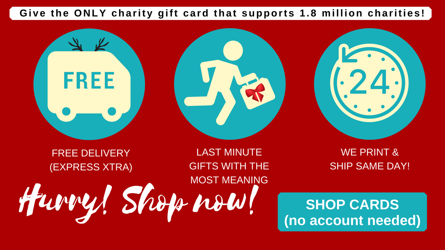 Award-winning, 1.9 million charities to choose from, the BIGGEST selection of charity gift cards and custom cards, perfect for corporate and personal giving, tax-deductible, and 100% donated!